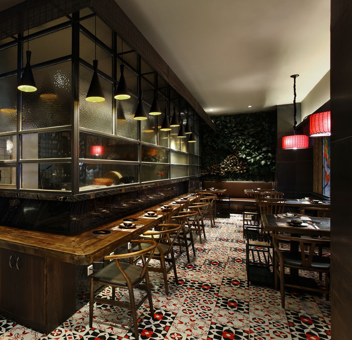 將火鍋文化和現代化管理融入餐飲業是現在餐飲業能走出重圍,脫穎而出的兩張王牌,本案定位為現代中式風格,為大眾化的百姓消費,同時體現一定的文化主題,為火鍋的經營賦予更有層次的文化內涵。紅色窗寬和灰色火山巖裝飾墻面的外觀,運用了中國古典的兩種顏色,給人一種古色古香的感覺。