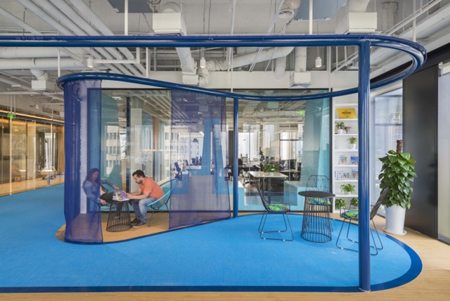 本案是旅游公司的辦公室裝修設(shè)計,室內(nèi)空間更偏向于年輕而新興,整個空間都是海藍(lán)色,為了讓這種視覺淋漓盡致的呈現(xiàn),深藍(lán)色的高架管道沿著大廳周圍循環(huán),劃分了大廳區(qū)域內(nèi)不同的小區(qū)域,地毯的顏色和海浪般的邊緣看起來像海面,透明的玻璃材質(zhì)則像是陽光,可以反射進(jìn)深處的空間,所以在光線上起到了輔助效果。