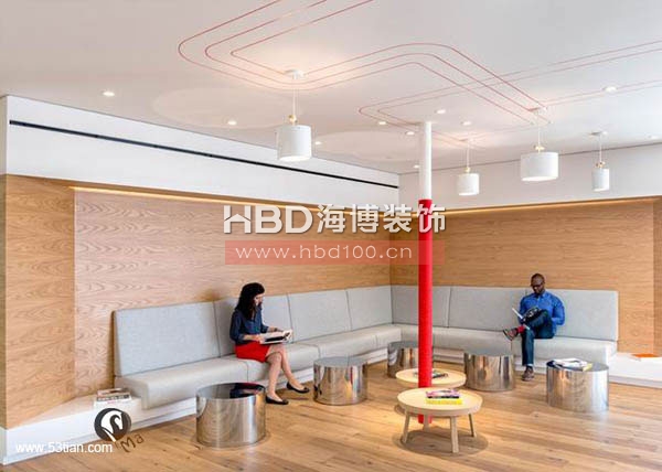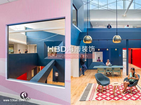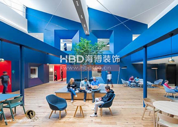 接下來(lái)廣州裝修公司海博裝飾小編帶你來(lái)看一組國(guó)外辦公室裝修純色劃分空間設(shè)計(jì)的案例,通過(guò)純凈的色彩來(lái)進(jìn)行空間隔斷,劃分出不同的功能區(qū)域。如下圖的辦公空間,藍(lán)色是各個(gè)部門的會(huì)客區(qū)、紅色區(qū)域設(shè)計(jì)為休息兼走廊、灰色與白色區(qū)域?yàn)楣ぷ鲄^(qū)域。整個(gè)空間使用顏色劃分區(qū)域來(lái)看,工作區(qū)顯得更為常態(tài),而展示給客戶的區(qū)域在用色上更為大膽。